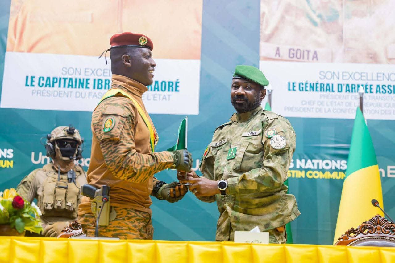À l’issue de la passation de charges entre lui et le Général d’Armée Assimi GOITA, Président sortant de la Confédération, le Capitaine Ibrahim TRAORÉ a salué le leadership de son prédécesseur, qui a permis la réalisation de plusieurs objectifs majeurs. Il s’agit notamment de la mise en place d’une feuille de route commune, de la force unifiée, de la création de la télévision et de la radio de l’AES, de la banque confédérale, ainsi que du passeport et de la carte d’identité biométrique communs.